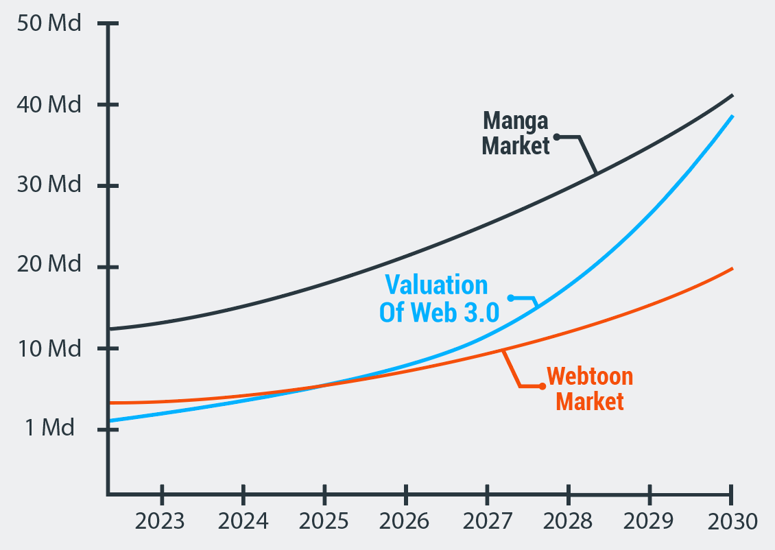 Here is a graph showing the evolution of the Market Valuation of Manga, Webtoon and Web 3.0 from 2022 to 2030 (estimate) :